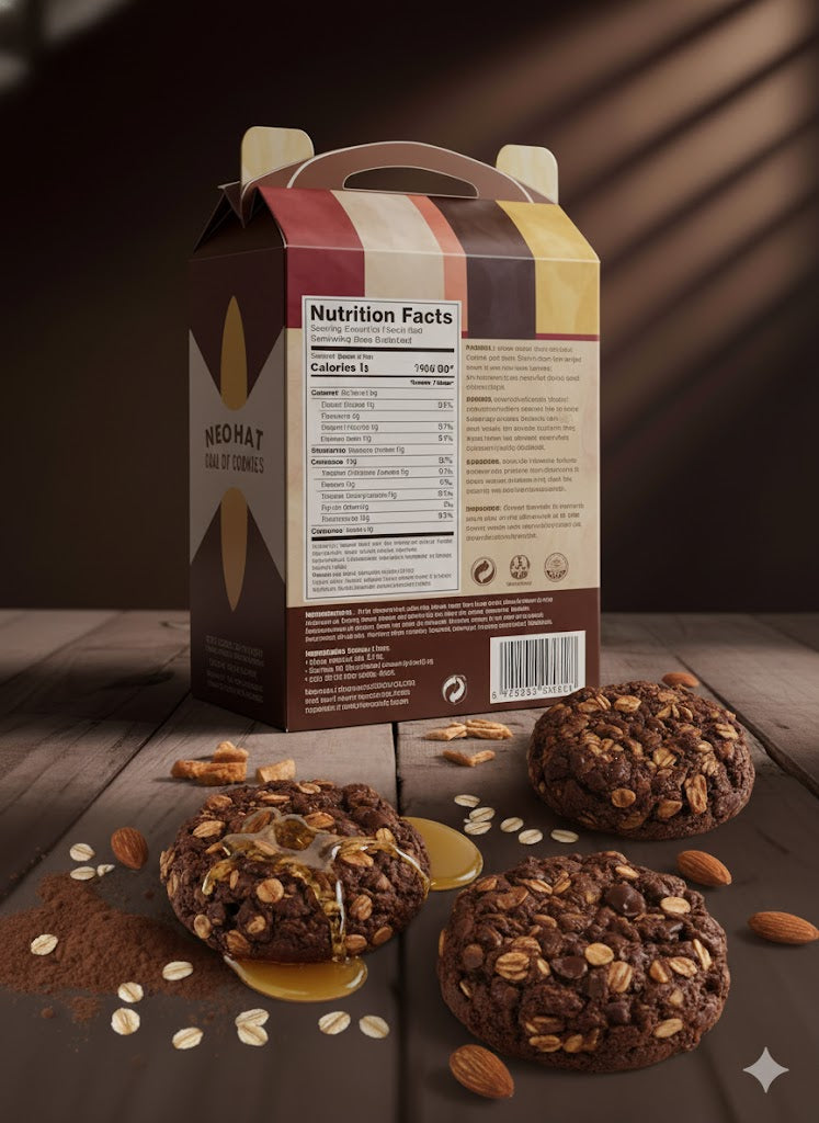 NEO HAT Healthy Cookies – Cocoa Oats are a deliciously wholesome treat made from rolled oats, natural cocoa, and nutritious nuts, lightly sweetened with honey. These cookies are baked to a perfect crunch, offering a rich chocolate flavor with the goodness of whole grains and plant-based ingredients.
